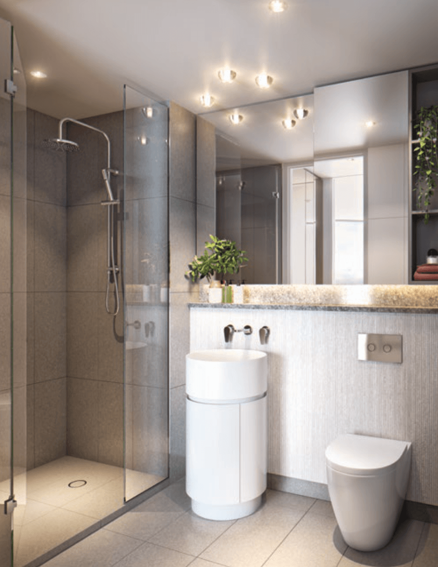 - Phòng tắm thiết kế tinh tế với kính bán không khung, vòi sen đôi, bồn cầu âm tường tiết kiệm nước